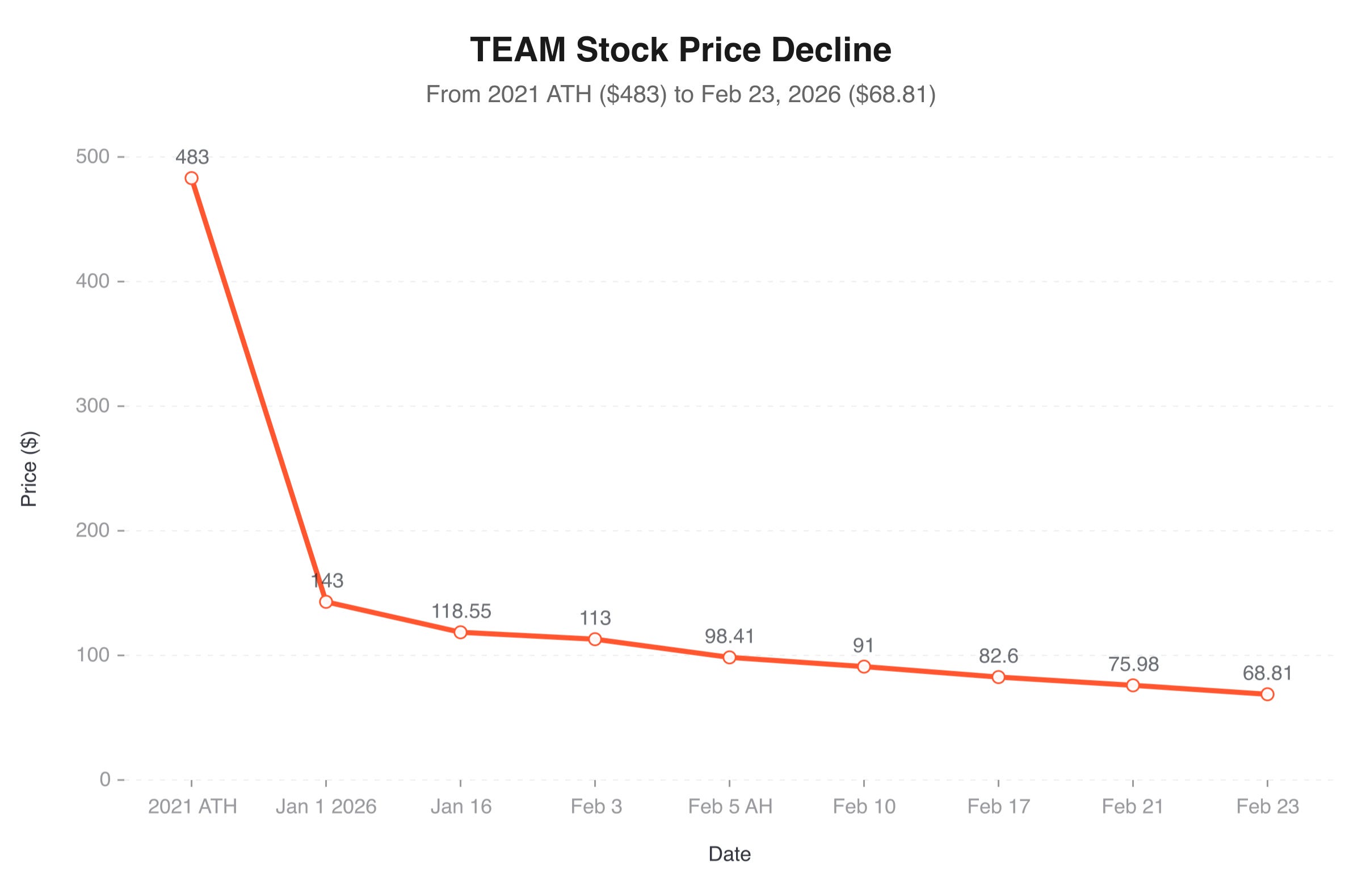 The after-hours drop on February 5 was just the appetiser. By the end of that week, TEAM was down 20%. Then it kept falling.