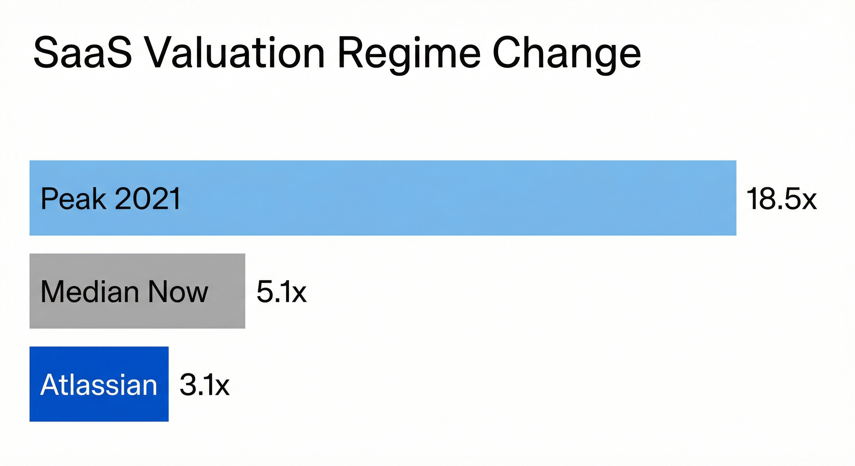 The median SaaS enterprise value to revenue multiple has compressed from 18-19x to 5.1x. Atlassian, at around 3x price-to-sales as of its February 23 close, is trading at its cheapest valuation in its history as a public company.