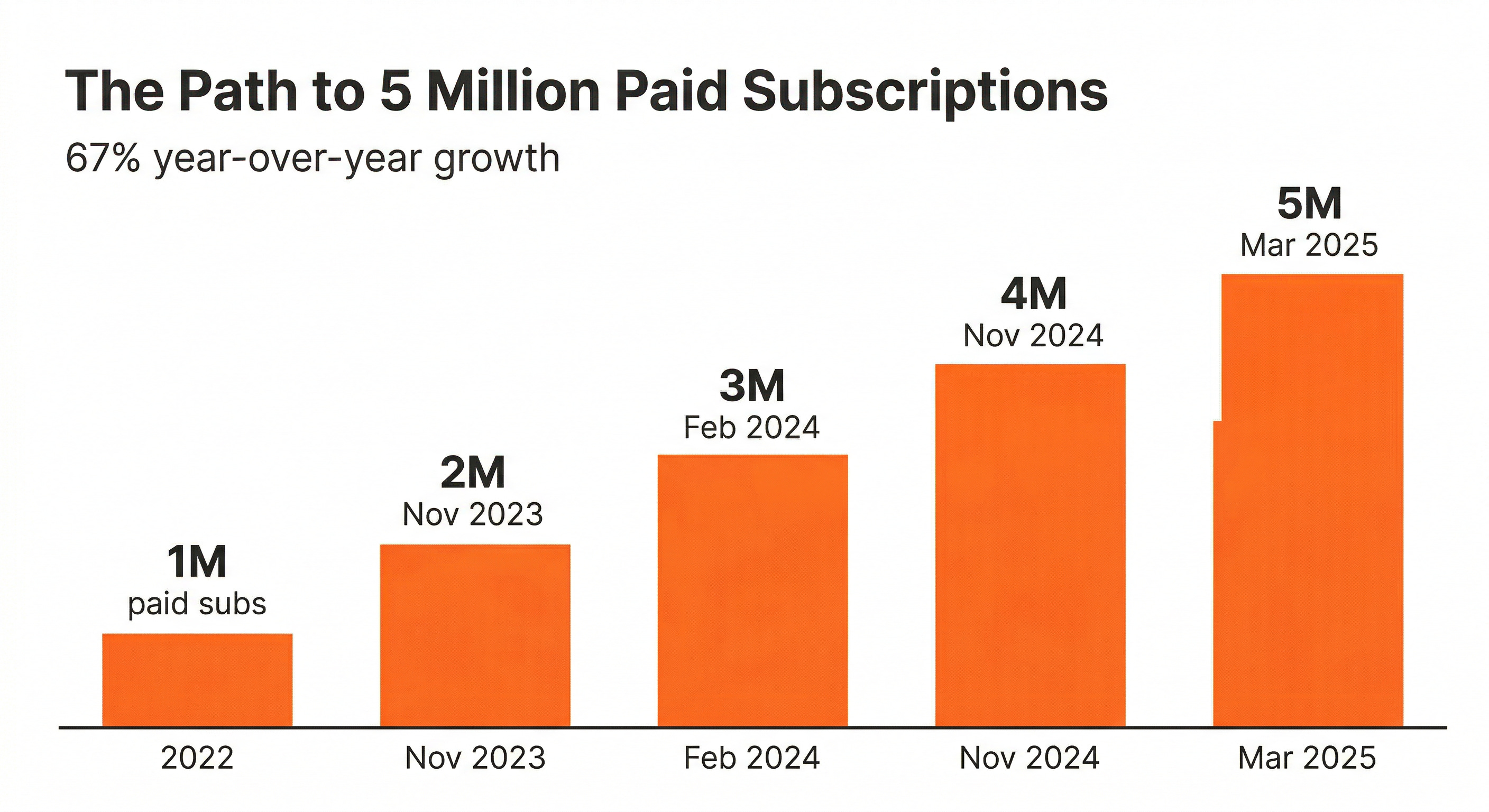 By March 2025, the platform announced 5 million paid subscriptions, 67% year-over-year growth. More than 20,000 publications had at least some paying subscribers.