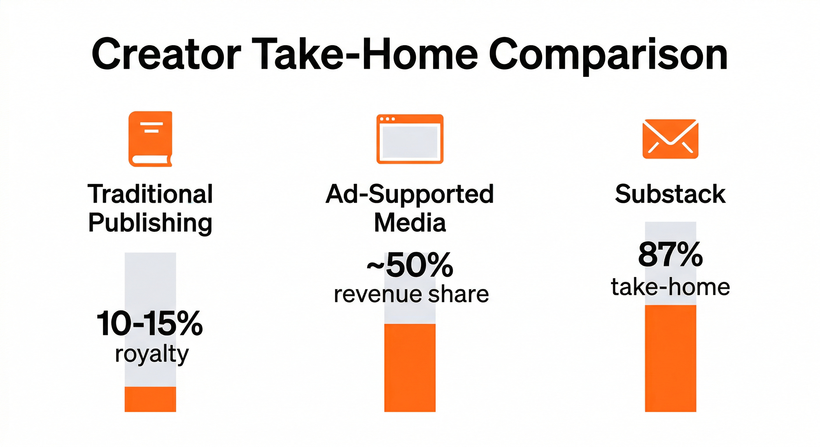 Compare that to traditional publishing, where an author might see 10-15% of a book’s cover price. Or journalism, where a staff writer’s salary represents a fraction of the revenue their work generates; the rest gets absorbed by office leases, sales teams, middle management, and whatever the strategy department does all day.