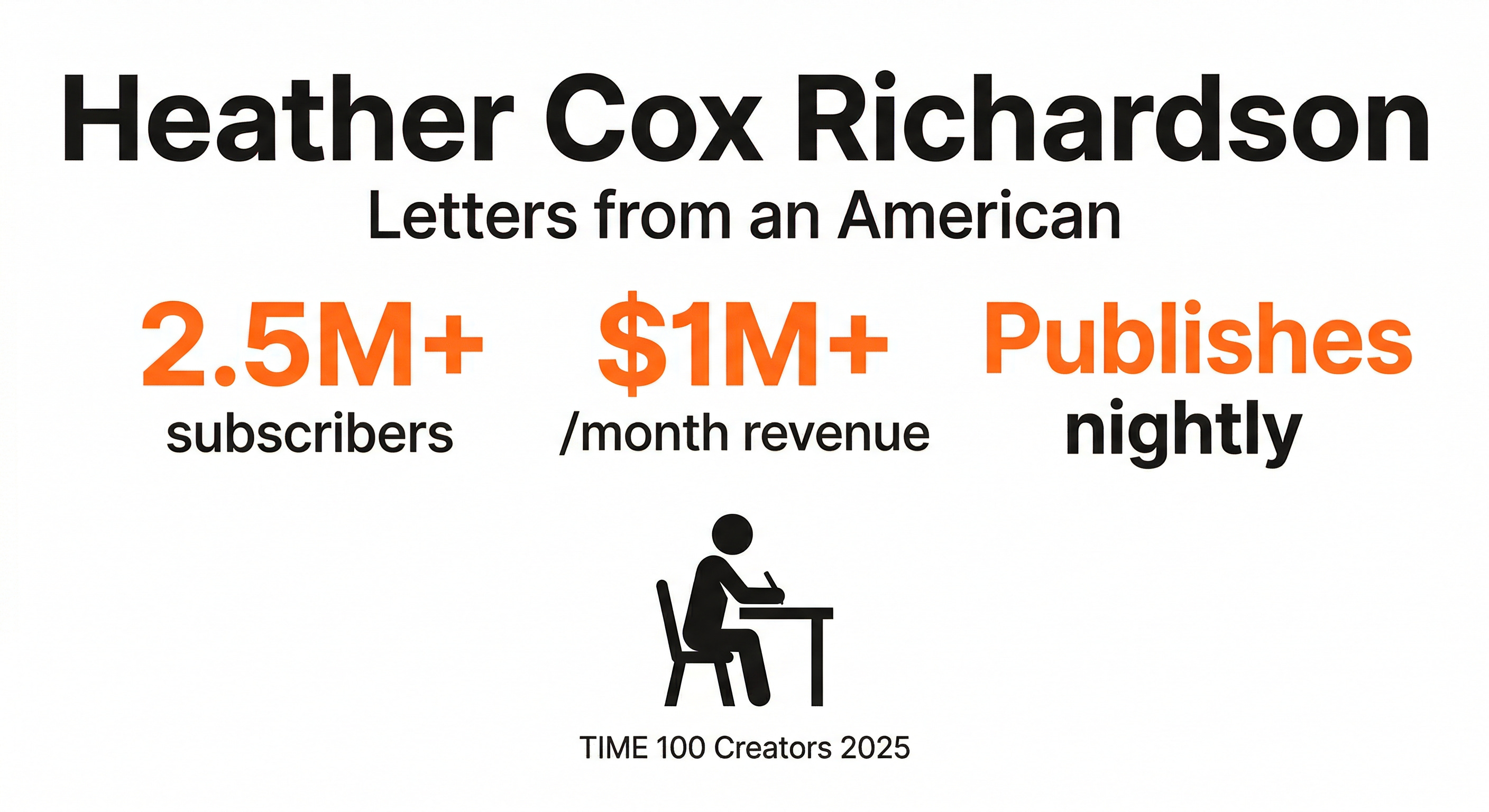 Heather Cox Richardson (Letters from an American) sits at the top. TIME named her to its 2025 Creators list, and the numbers are staggering by any standard. With more than 2.5 million subscribers and an estimated 200,000+ paying, credible analyses put her revenue above $1 million per month. She publishes almost every night, writing accessible political history that connects past to present. No staff. No sales team. Just her, a laptop, and an audience that grew one subscriber at a time.
