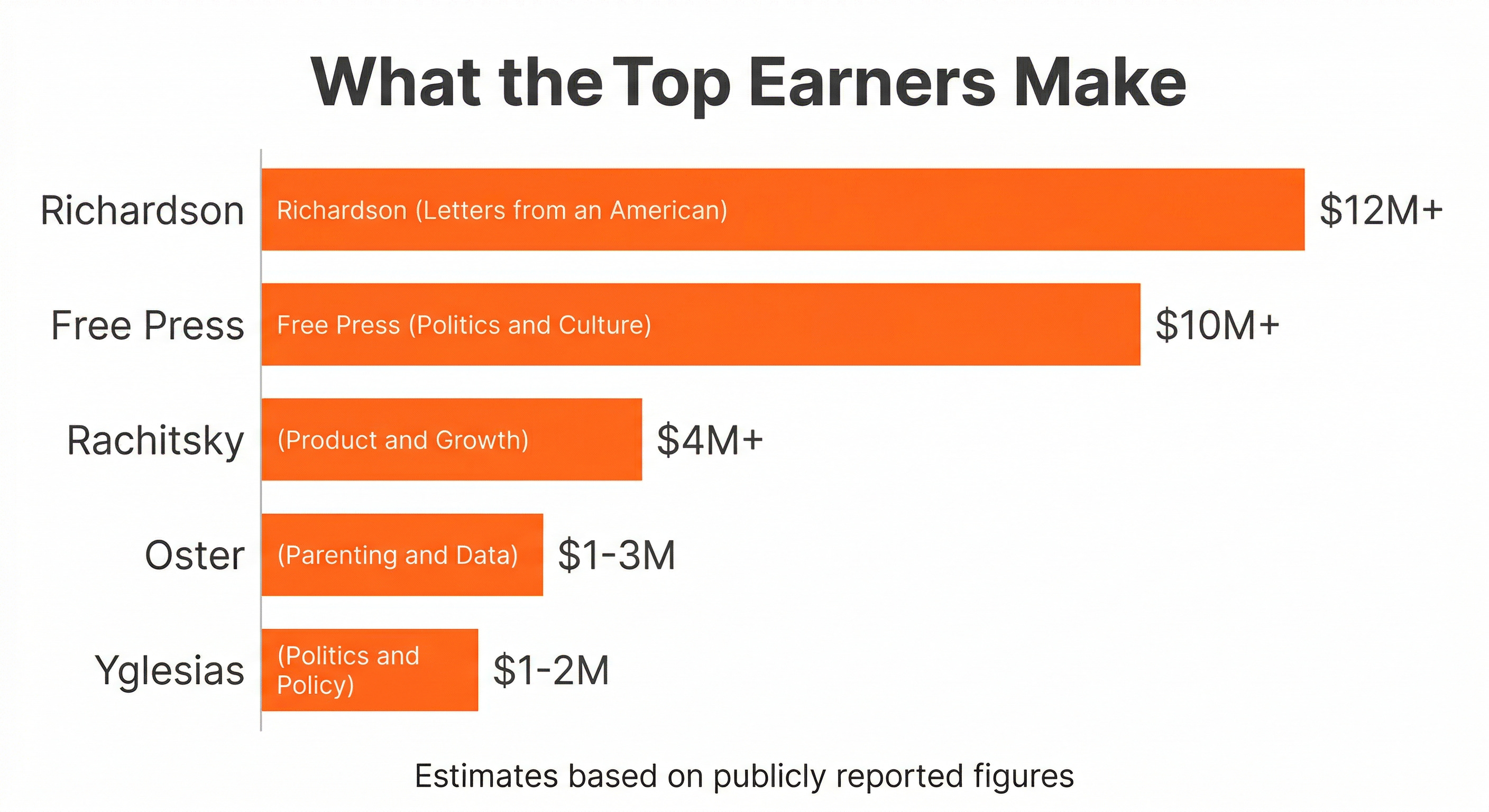 Revenue estimates for individual Substack creators are, by necessity, imprecise. Substack doesn’t publish individual earnings. But between public statements from writers, reporting from outlets like Semafor and the New York Times, and some straightforward maths based on disclosed subscriber counts, you can sketch a reasonable picture.
