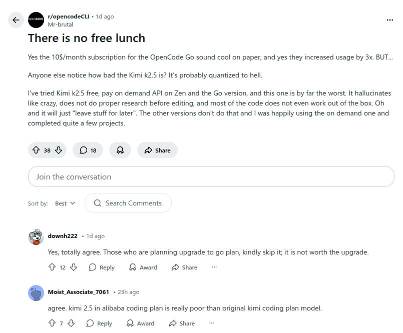 Compare this to the $3 plans. No cost breakdowns. No explanation of how the pricing works. No disclosure of quantisation levels or data handling practices. No open-source evaluation tools. Just a price that’s too good to be true, offered by companies with the resources to absorb short-term losses indefinitely.
