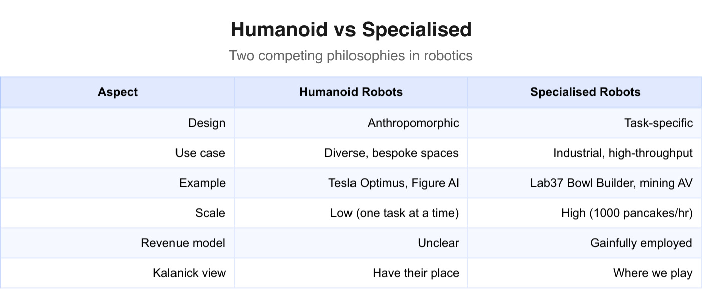 The phrase Travis kept returning to in the TBPN interview was “gainfully employed robots.” The idea is simple: build robots that are specialised for a specific task, that can generate revenue doing that task, and that are designed for the job at hand rather than designed to look like a person.