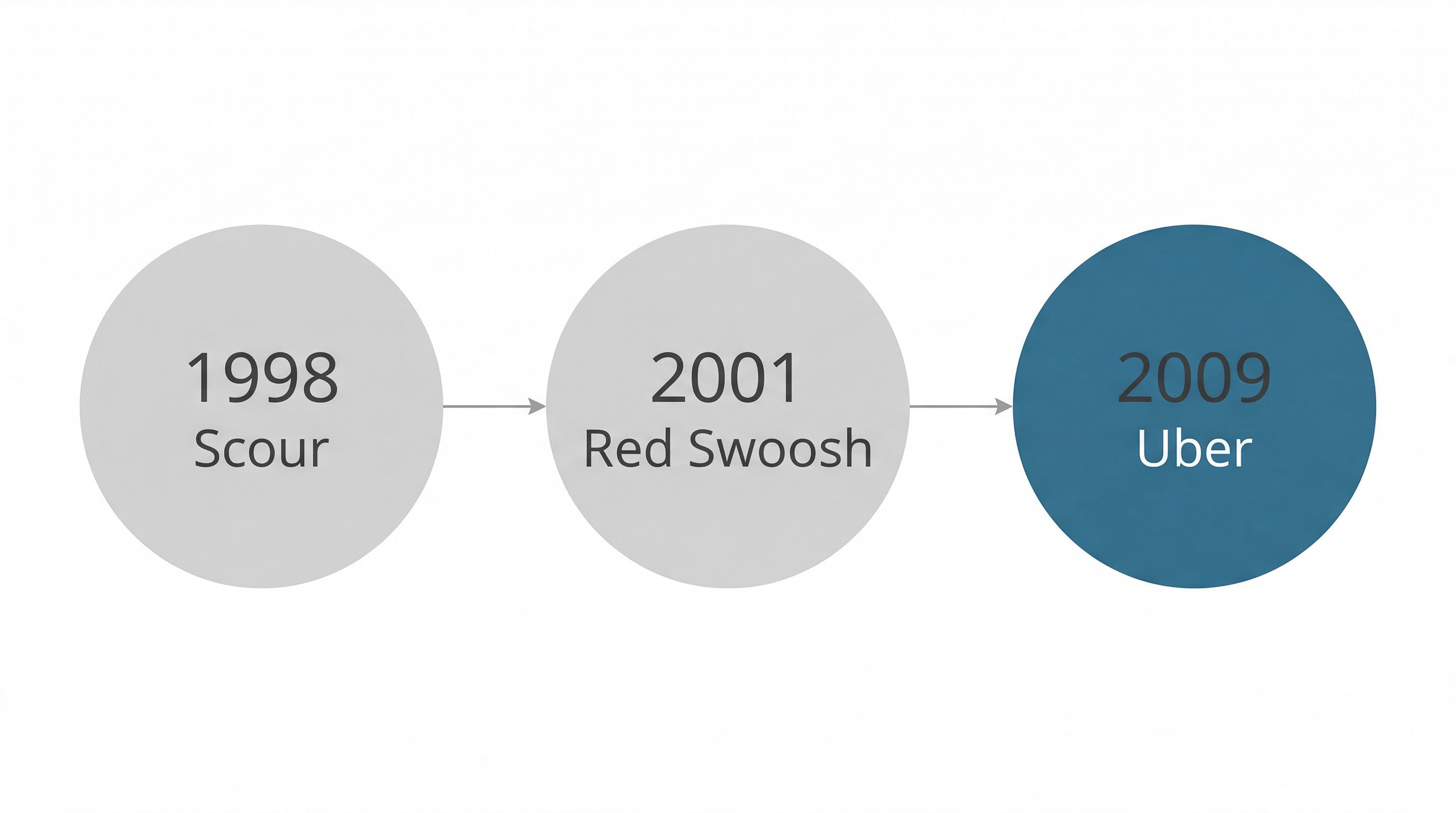 What Travis did next is the part of his biography that tells you the most about him. He founded Red Swoosh in 2001, a peer-to-peer content delivery network. Same underlying technology as Scour, stripped of the copyright liability. Legal P2P.