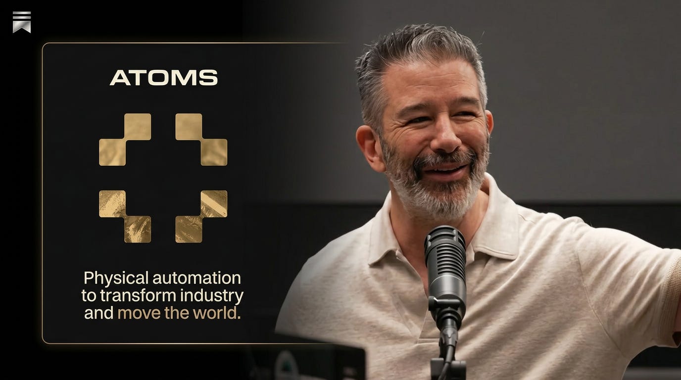 Travis revealed the rebrand live on air. City Storage Systems was now Atoms. Three divisions: Atoms Food, Atoms Mining, Atoms Transport. A manifesto had gone up on atoms.co/vision. The thesis was physical AI and robotics. Not the humanoid kind, but specialised machines that could do productive work. He called them “gainfully employed robots.”
