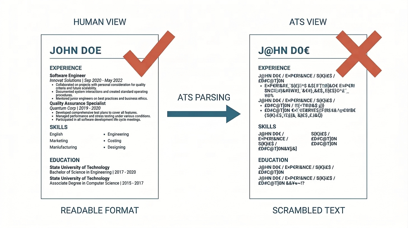 Canva resumes fail in ATS systems because of how Canva constructs documents at the file level. The visual output looks professional. The underlying file structure is a minefield. Four distinct failure modes exist, and most Canva templates trigger at least two of them.