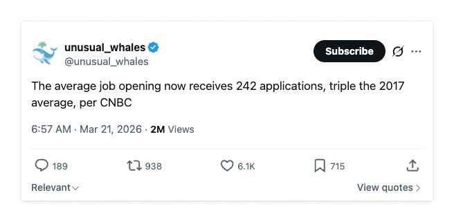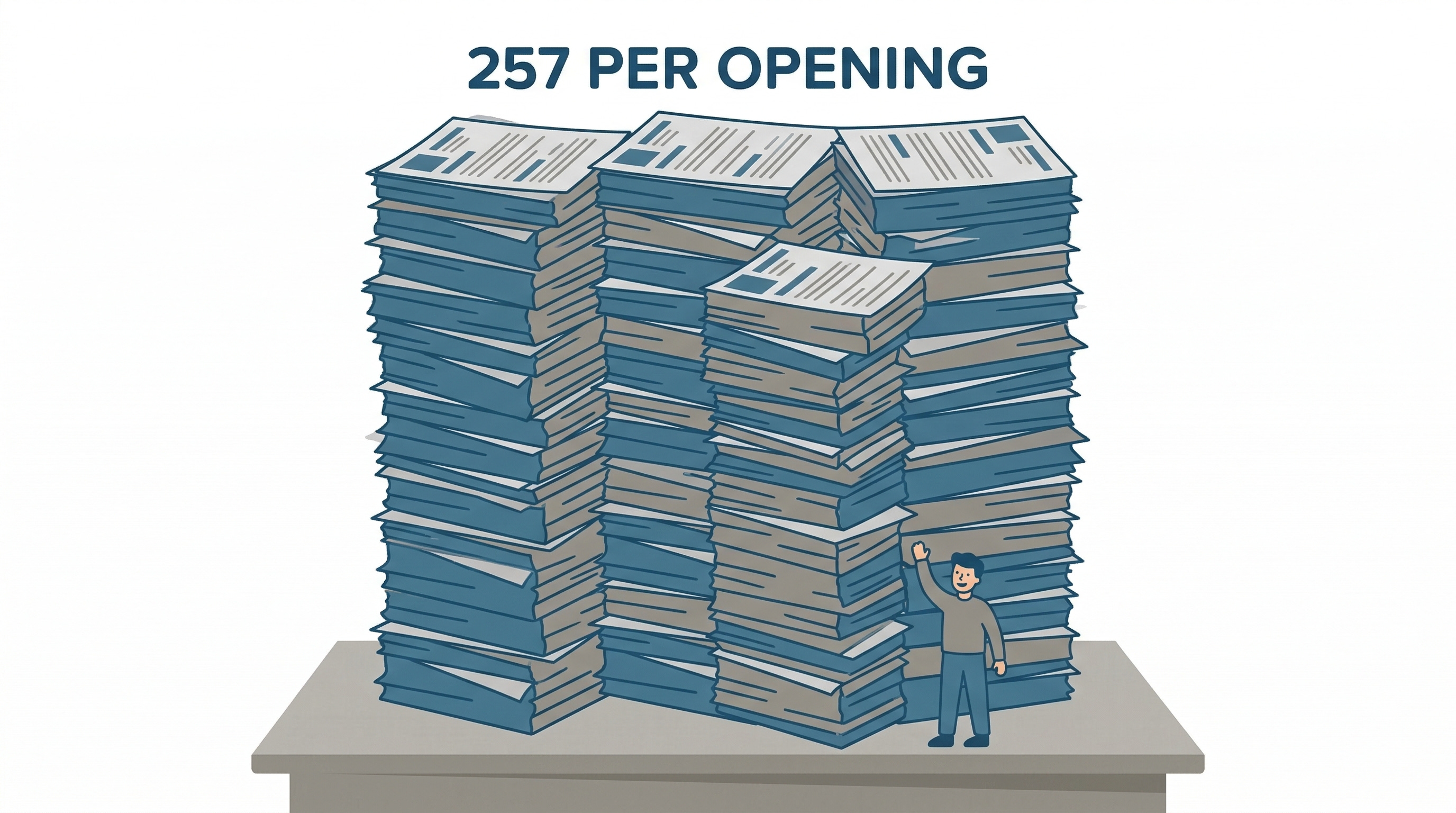 For every job posting you apply to, roughly 257 other people are applying at the same time. A meaningful portion of those competitors are using AI to apply faster and to more roles simultaneously, which feeds right back into the volume problem.