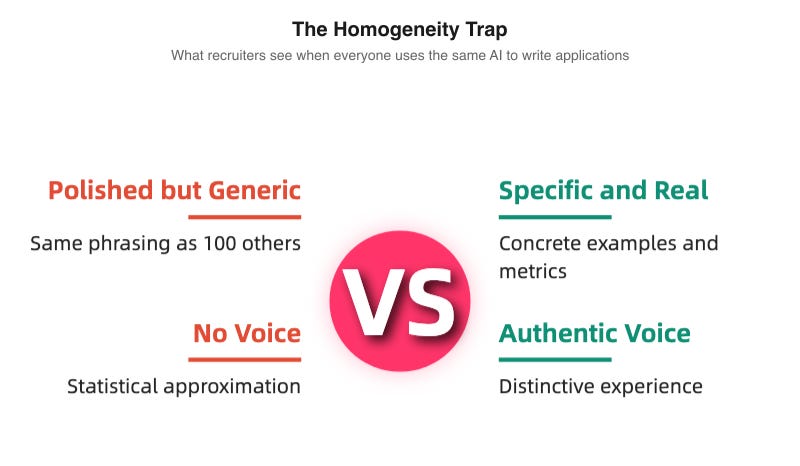 When everyone uses the same AI to write their applications, everyone sounds like the same person. A recruiter scanning a stack of AI-generated resumes is reading variations on a single voice. Individual qualifications blur together. Distinctive experiences vanish behind a wall of polished, interchangeable prose.