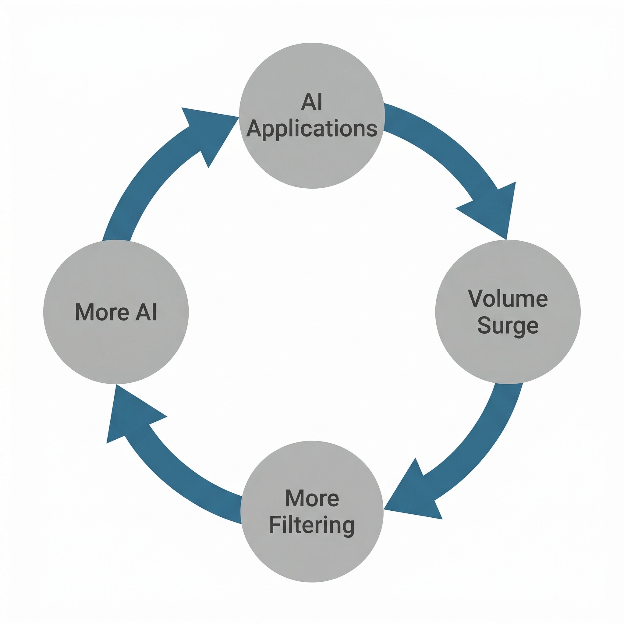 Job seekers use AI to apply faster and to more positions, which increases application volume, which overwhelms recruiters, who respond by relying more heavily on automated filtering, which incentivises applicants to optimise further for those filters, which makes applications more homogeneous, which makes it harder for anyone to stand out.