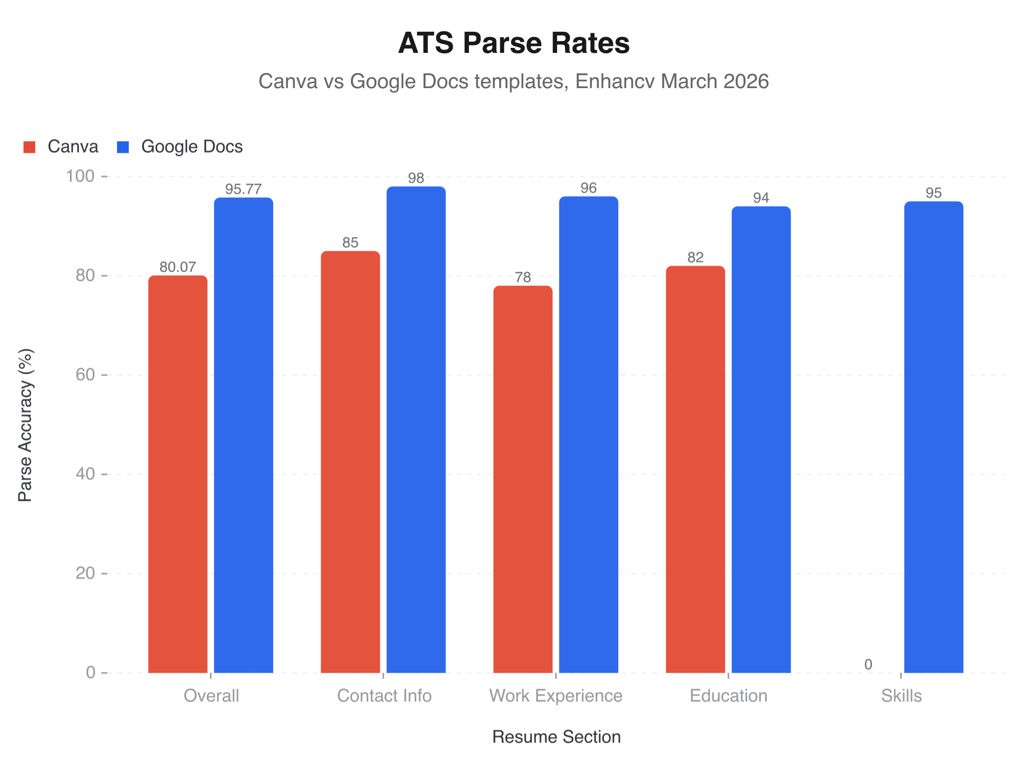 Enhancv tested Canva templates against Google Docs templates (a study originally conducted in late 2023 and updated through 2026), measuring how accurately each format parsed through common ATS systems. Canva averaged an 80.07% parse accuracy rate. Google Docs averaged 95.77%. That fifteen-percentage-point gap represents a substantial chunk of your professional history that the ATS either misreads or ignores entirely.